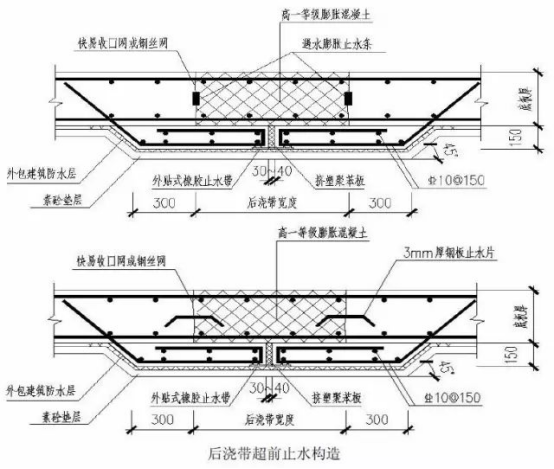 在基础工程完成后,进行外墙防水、土方回填等后续工作。当上部结构荷载能够抵抗地下水浮力时停止降水。在主体完成后,可以浇筑后浇带时,再浇筑后浇带处的混凝土。基础底板、外墙的后浇带超前止水构造见下图。